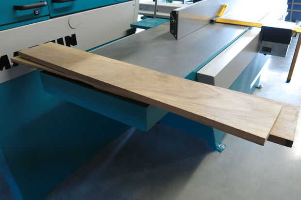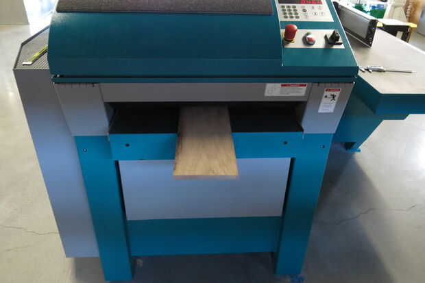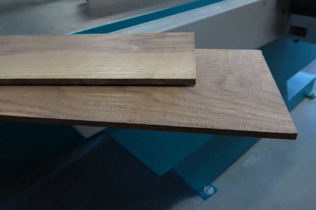 Había planeado el tablero nogal hasta ¼" de espesor. A partir de un tablero más delgado hubiera sido ideal y requiere menos planificación. Si no tienes acceso a los tableros más finos, usando una sierra de cinta puede cortar la placa en la mitad, dejando a usted con dos tableros de la mitad del espesor original. Recomiendo hacer esto en vez de cepillar lejos la mayor parte de su Junta Directiva.