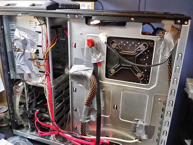 5. use la cinta para sujetar los cables en el panel trasero, esto hará que no los alambres/los cables están colgando de la manera. Si no lo hace no es capaz de cerrar el caso.