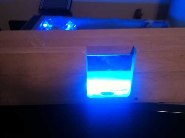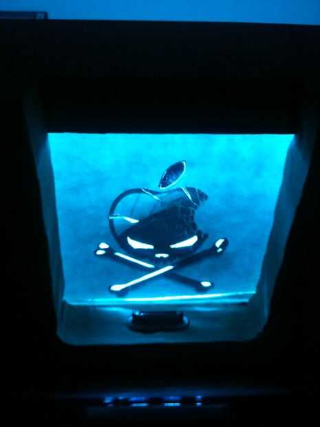 (Foto 5 y 6) El Iphone Dock idea vino un poco después de que se hizo con los ponentes y participan nada más entonces cortar el tablero frontal al ras con el inferior, una pieza de plexiglás y el pequeño agujero oval para el conector del iPhone. Después fue fijado hasta busqué alrededor de una imagen de la manzana fresca, encontró esta manzana de la muerte impresos hacia fuera, y cortar algunas partes pensé vería fresco resplandor a través de. Una vez cortado a la medida intercalada entre otro pedazo de plexi y tomé un Neon azul de 12 pulgadas (con 4 pines) de monoprice y montado en el tablero inferior justo detrás el plexiglás.