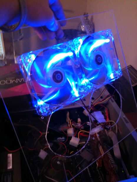 (Imagen 6) Finalmente, los agujeros son corte y su tiempo a intentar montar mi hong Kong especial azul LED Fans! Utilicé tornillos ventilador de unos viejos de PC y un soplete para calentar el plexiglás. Quería permitir el tornillo al grifo en el plexi calentado. Una vez conectado solo tuvo que ver cómo se veían en prueba Fix - 2 azul LED Fans éxito.