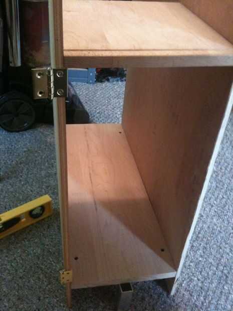 (Imagen 3) El estante en el armario de la izquierda se utiliza para el almacenamiento aleatorio y tiene mi modem y router. Las bisagras que se encuentra espacio de Walmart, tuvo que ser incluido en la madera aproximadamente 1/4 de pulgada y luego recortado al ras por un lado, (¡ gracias Sierra)