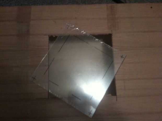 (Imagen 4) El siguiente fue el ventilador/plexi del agujero que necesita ser cortado, una vez medidos y alineados taladrar 4 orificios en todas las esquinas para que me deje entrar dremel a hacer aberturas lo suficientemente grandes para usar una sierra de mano. Los agujeros donde luego perforados en las 4 esquinas de la plexi para unir al gabinete.