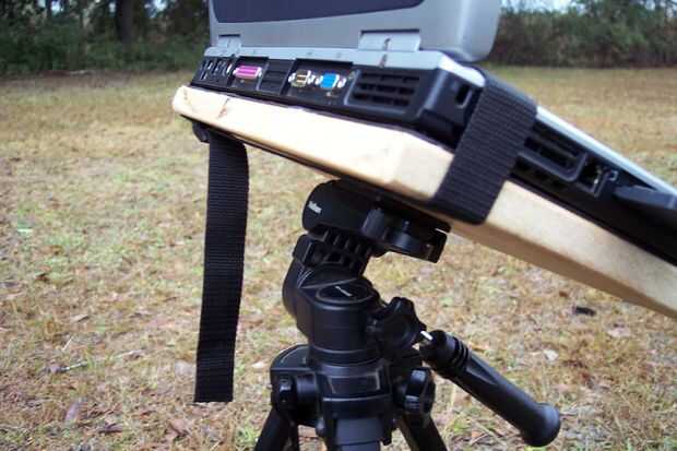 A continuación, encontré una vieja correa algo largo olvidada. Atado el portátil hasta la base. Cuidado de mantener puertos de ratón, acceso dvd Bahía claro.
