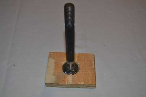 3 Coloque el perno en la parte superior el 2 y 1/2 por 3 y 1/8' pedazo de madera con el orificio de 1 pulgada se aburre en ella.