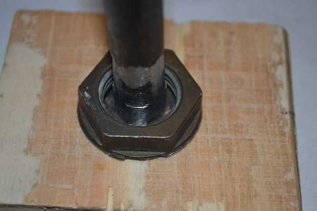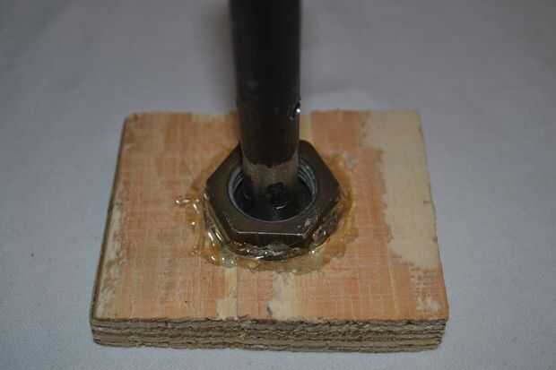 5. caliente pegar la arandela de anillo de metal a la pieza de madera, no el perno. el perno ahora debe girar suavemente.
