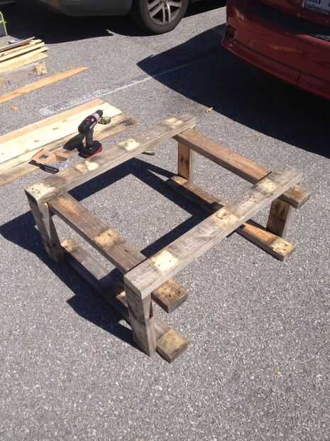 Una vez que tuviera los lados atornillados juntos y cuadrado, cortar tres tramos de 2 x 4 para conectar los laterales, dos en la parte superior y una en la parte posterior para que mis piernas sean capaces de pasar por debajo de la mesa. También corté dos trozos pequeños de scrap para colocar en la parte delantera para que coincidía con el estilo del resto (ver en fotos más adelante)