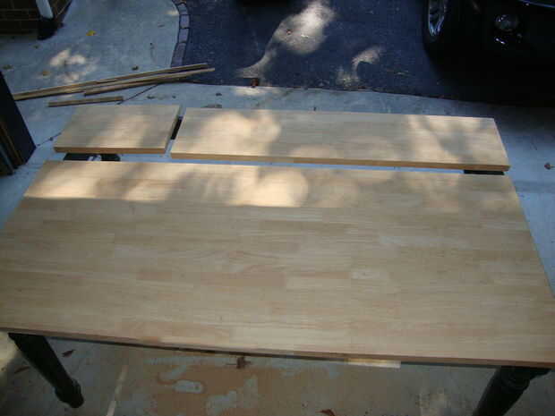 Cosas me lleva a diseñar requisito 2: un estante elevado ligeramente más corto (en ancho) que el escritorio sí mismo. SSO I(you) cortar el resto a 3½' de longitud, dando ese extra tercera pieza en la imagen.