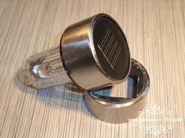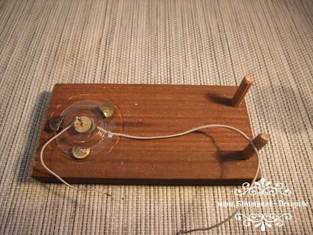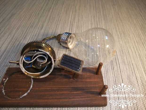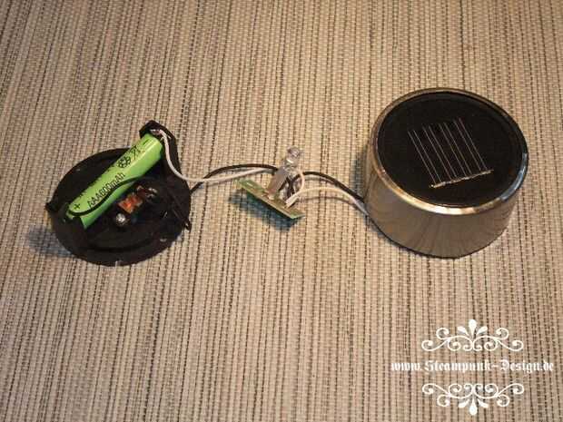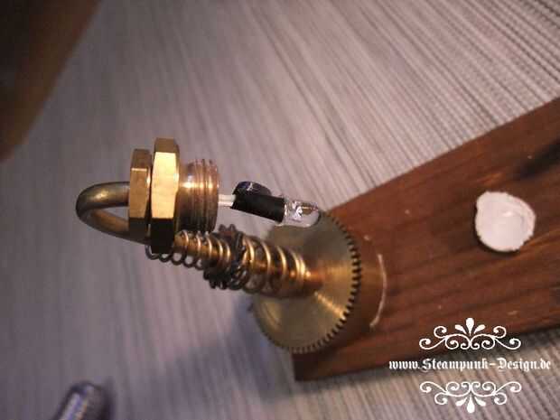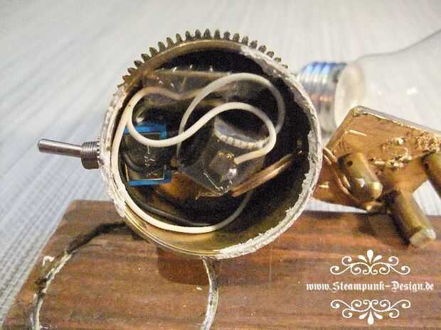 Más tarde el circuito se coloca en la base de la lata con el interruptor y la batería y los cables de LED pasa por el tubo de cobre a la bombilla.