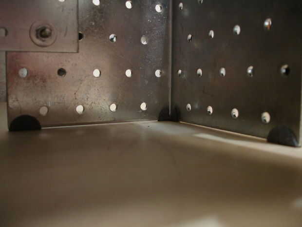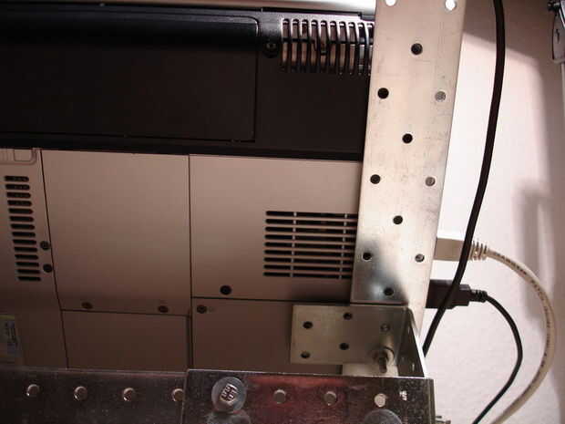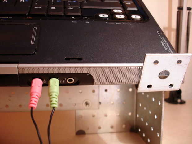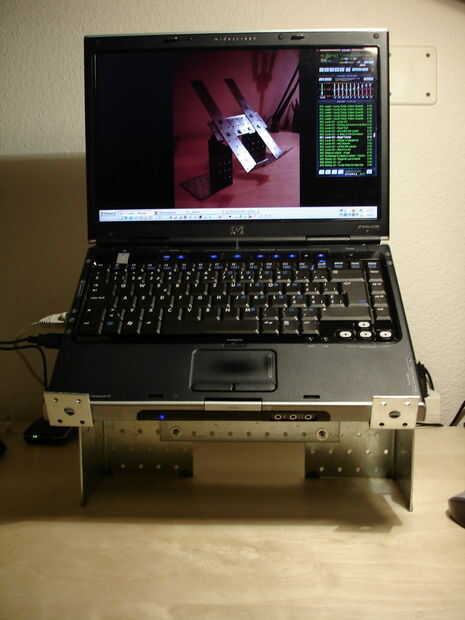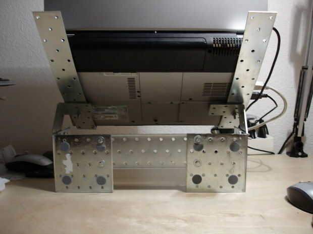 Ahora se invierte la base y descansa sobre los bordes de los ángulos. Los dos soportes están en los bordes exteriores, esto mejora el flujo de aire y el acceso a tomas de micrófono y auriculares. Los soportes están doblados levemente para permitir que la cabeza del perno para el portátil, ahora se basa sobre todo en sus propios pies de goma.