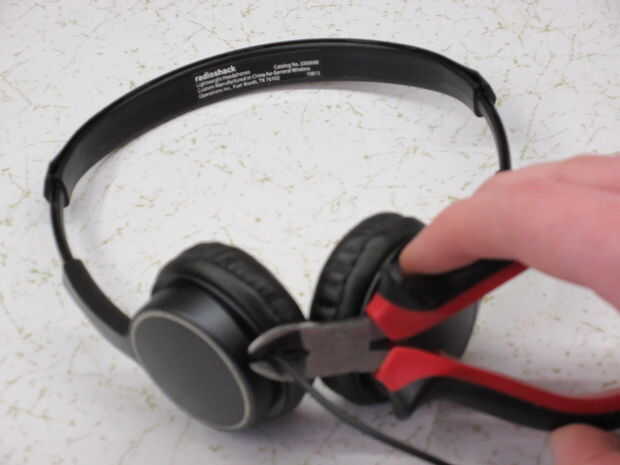 Para iniciar, es necesario deshacerse de todos los alambres de exceso que se pondrá en nuestro camino más adelante. Si los auriculares se hicieron barato como el mío, los cables deben ser fácilmente accesible y por lo tanto, fácilmente extraíble. Tratar de eliminar todos los cables que ves, incluyendo el cable con el enchufe (aunque mantener que, podría ser útil algún día) y los cables pasando por la banda. Intente quitar cualquier plástico que también podría obtener en el camino donde se perforará los orificios para los tornillos.