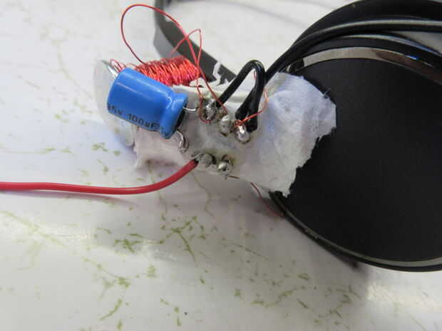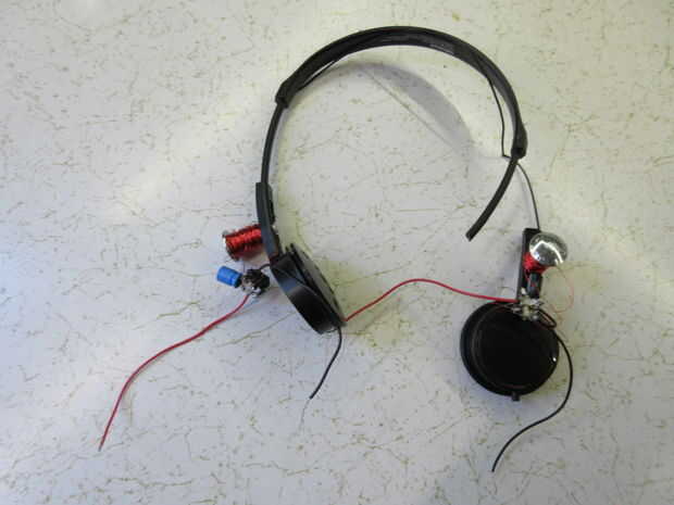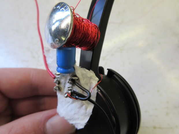 Los amplificadores son ahora completa y funcional. Vuelva a colocar el 386 ICs en los zócalos y conectar la batería de 9 voltios para el circuito en los mismos lugares que la última prueba. Debe oír una luz estática en el auricular. Mientras que no recomendaría probar los auriculares en todavía, por los circuitos sigue siendo algo frágil, colocando su teléfono celular cerca de la bobina debe crear una señal lo suficientemente alta para ser escuchado incluso sin usar los auriculares.