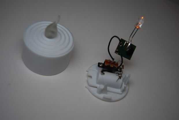 Suavemente Retire la electrónica, será necesario sacar el led de la silicona 'flame'. Verás el led conectado a una placa de circuito impreso (PCB) y el PCB a las baterías y el interruptor.