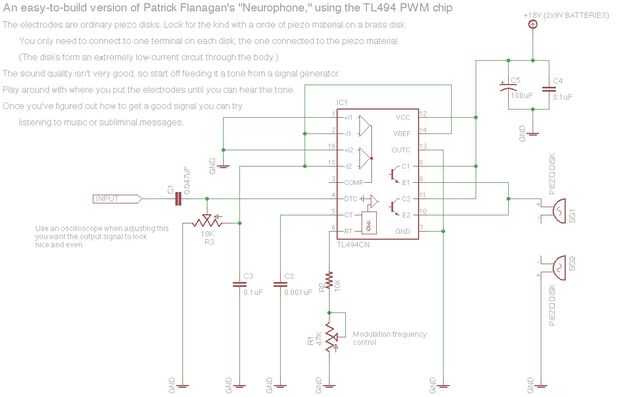 Para hacer la señal de ultrasonido, vamos a usar un controlador de modulación de anchura de pulso TL494 ampliamente disponibles. Esto no es una solución perfecta, para que no oiga la señal como con uno de los diseños de Flanagan. Pero es mucho más simple que jugar con DSP. Y te ofrece una oportunidad para experimentar y experimentar con el efecto "Neurophone".