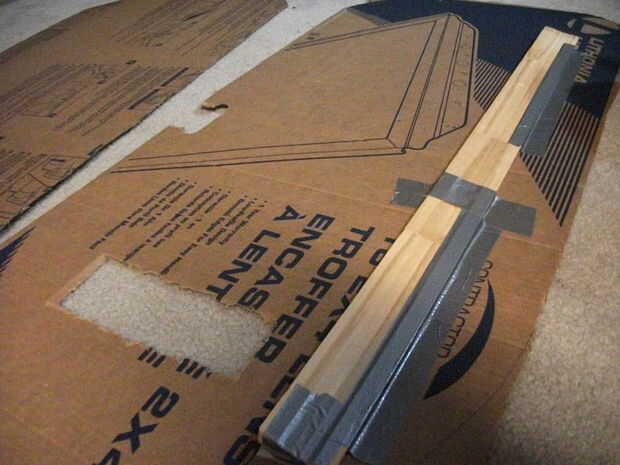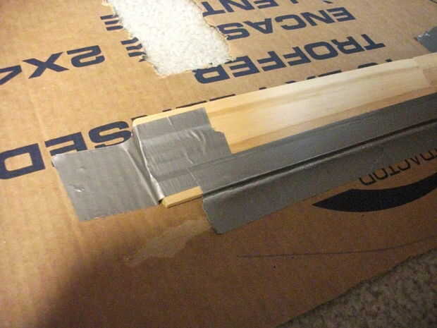 Aquí viene la diversión parte. Abrir tu escudo para que las dos piezas están al lado uno al otro. (La cinta en el lado de cuando usted corte el agujero del ojo hará que abra como un libro. La cinta en la parte superior tendrán que ser eliminados) tome la primera tira de madera y con cuidado la cinta hacia abajo. Utilice la cinta de conducto longitudinal y asegúrese de que obtener un pliegue agudo entre la madera y el cartón.
