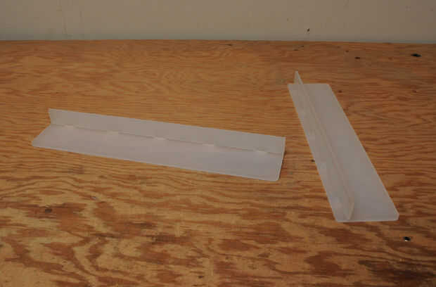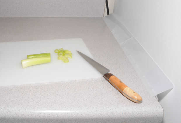 Eso es todo allí está a él! Coloque las dos secciones del escudo sobre la brecha, con las piezas más cortas de plástico en el bajo lateral, junto a la encimera. Los escudos simplemente descansan contra la encimera y la nevera, y gravedad los mantiene en su lugar. Ahora los pedacitos de apio aerotransportado que habría caído en la brecha, se terminan en el mostrador en lugar de otro.