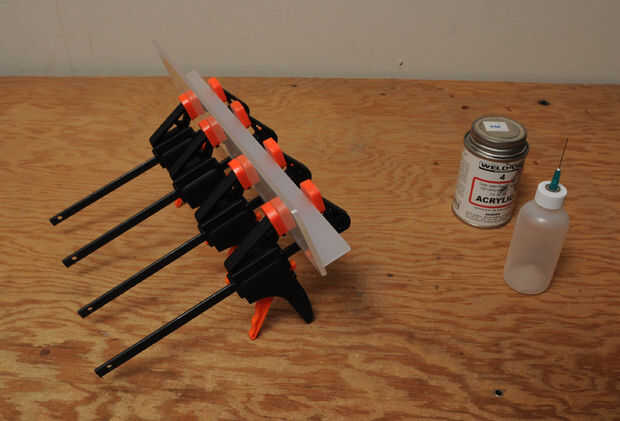 He hecho el escudo en dos secciones por lo que encajaría en el cajón entre usos. Para cada sección, inserte las lengüetas en el más pequeño pedazo de acrílico en las ranuras en la pieza más grande. La abrazadera firmemente para mantener en su lugar durante la operación de cementación. Luego Aplique cemento acrílico a la articulación con el aplicador de tipo aguja. Permite endurecer la noche antes de quitar las pinzas.