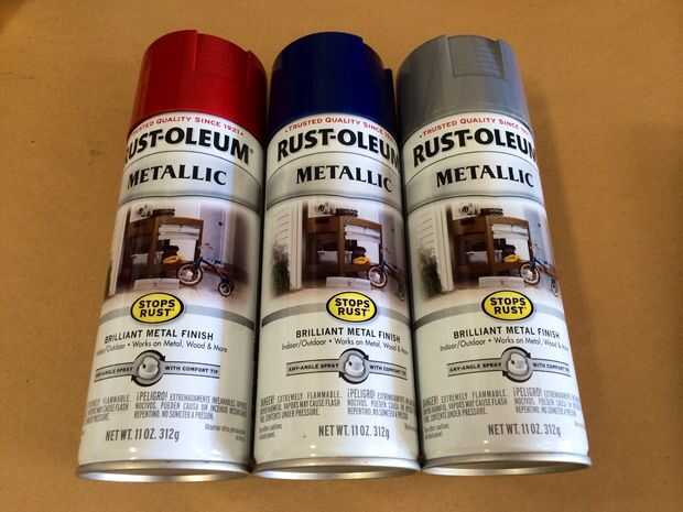 -Pintura metálica rust-oleum en colores: azul cobalto, plata y rojo de Apple ($23-25)