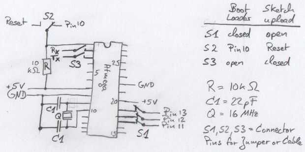 El esquema más muestra las conexiones de + 5V y tierra (GND), 16 MHz oscilante cuarzo (Q) y sus condensadores cerámicos de 22pF (C1), la resistencia de pull-up de 10kOhm (R) y por supuesto el ATMEGA328.
