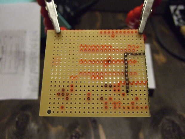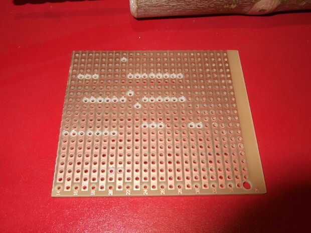 Luego tomé mi cortador de fantástica pista DIY y poner todas las interrupciones de la pista en el tablero. Para no confundirse, cada ahora y después pegué un alambre por un agujero marcado desde la parte superior para fácilmente hacer un seguimiento de las ubicaciones correctas.