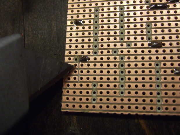 Para crear el interruptor S1 con puentes de moda antigua, determina la ubicación de los contactos del interruptor y con la alfombra cuchillo con cuidado corta los 3 rastros entre cada uno de los dos agujeros de la conector. El conector de la 2 parte posteriormente fue soldado en la placa para que el puente podría salvar la interrupción. Confirmó que la pista fue completamente interrumpida por probarlo con el voltímetro.