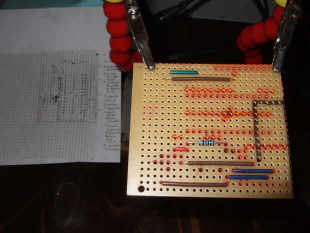 Cuando terminaron todas las interrupciones, me mudé a poner los cables del puente y la resistencia en el tablero y soldadas a las pistas. Elegí rellenar la junta con las piezas de la altura más baja primero. Esto me permitió poner el tablero en su parte posterior para soldar. Poco a poco movió a mayores y mayores los componentes utilizando la misma estrategia hasta que terminé.