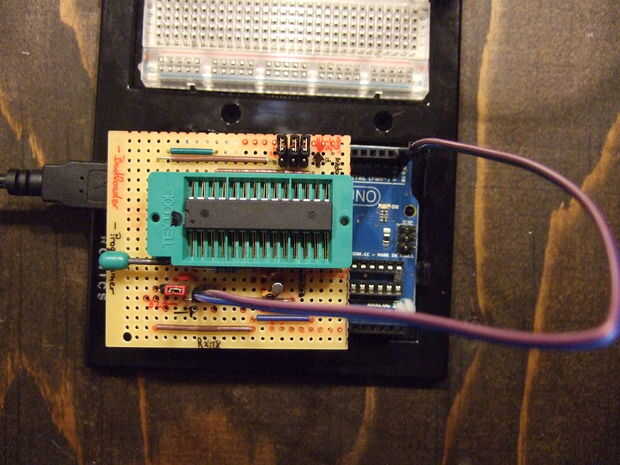 La figura muestra la pantalla en la configuración del programador que se explica por el pop-up notas. Antes de utilizar esta configuración y carga de un bosquejo para el ATMEGA, sin embargo, usted necesita quitar el ATMEGA que está conectado a tu Arduino. Estoy de acuerdo que esto es un poco incómodo. ¿Por qué utilizar un escudo, cuando sólo puede conectar el ATMEGA que desea programar en Arduino y allí? A couple razones: 1) zócalos IC estándar no se hacen con frecuencia conectar y quitar ICs. Están diseñadas para el intercambio ocasional de un IC roto. Cuanto más usted enchufe y quitar, más probable es que se desgaste y su Arduino. 2) cuando matan mi hucha te seguir adelante y comprar un USB Programador Serial. El escudo me permite cargar un bootloader y un dibujo con la misma mancha rápida del programa un aparato de esos para conectar toma de IC. Es el objetivo final, pero ahora utilizo lo que tengo.