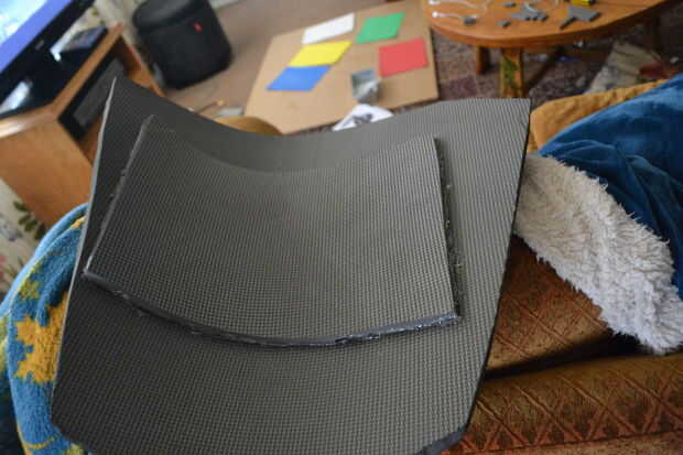 Cortar la espuma de EVA en forma de escudo. Una buena manera de medir cuán grande debería ser es colocarlo contra su cuerpo. El escudo debe ser el tamaño de su torso entero. Si quieres endurecer la espuma, usar una pistola de calor o colocar una losa secundaria de espuma en el interior para la estabilidad.