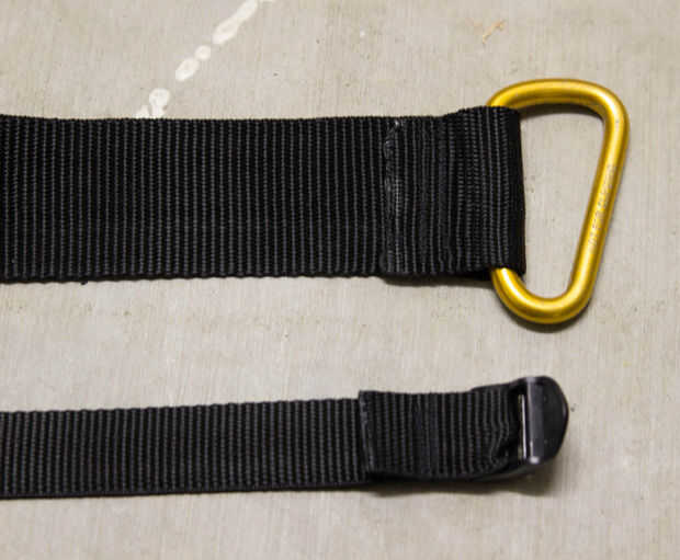 Coser un lazo en un extremo de cada tira y los enlaces/mosquetones rápidos a través de la alimentación.
