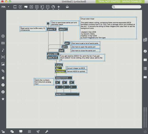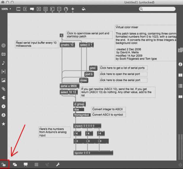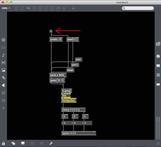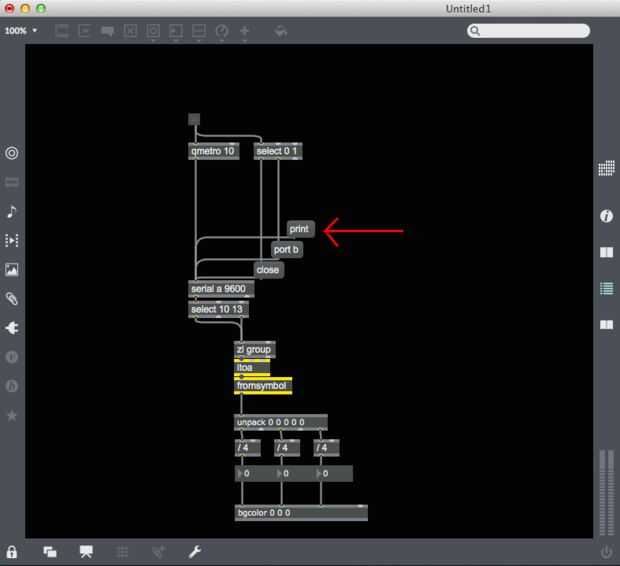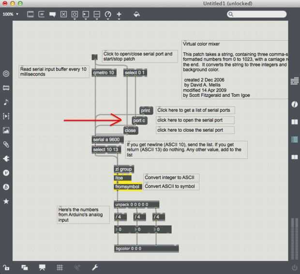- Presione 'imprimir' y mira en la Max Console a la derecha para ver que Puerto tu Arduino es pulg por ejemplo puerto C