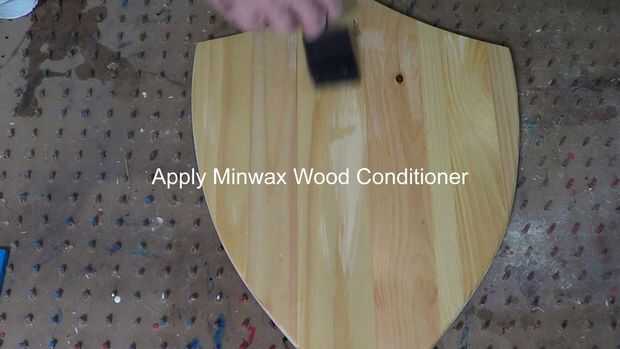 Aplicar acondicionador de madera Minwax y dejar reposar por varios minutos. Por instrucciones de la lata.