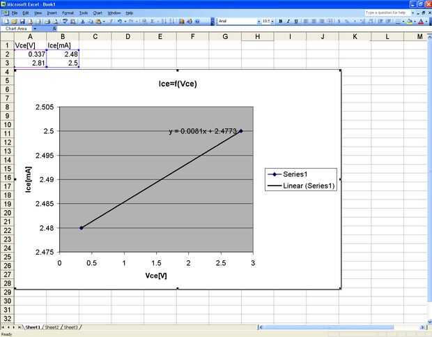Llena el calculado Vce y la corriente correspondiente en el archivo de excel. (cuadro 3). Gráfico se realiza, y línea de tendencia correspondiente a la fecha se muestra (línea recta). Se muestra la ecuación de la línea de tendencia - que se utilizará para los cálculos.