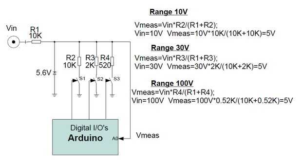 Vamos a empezar con el voltímetro. En la foto, se aprecia su esquema simplificado. Tres divisores de voltaje (para las tres gamas) puede ser formados o bien por el uso de interruptores controlados por la placa "Arduino". Sólo un interruptor está cerrado durante la medición de voltaje. Como interruptores uso modo de realce NMOS transistores del tipo BSS123 de conmutación. Tienen Ron típico alrededor de 6 a 10 ohmios, que no afecta mucho la precisión de los rangos 0-10V, 0-30V. Para la gama 0-100V, su Ron se tiene en cuenta, en el cálculo de la relación del divisor de tensión.