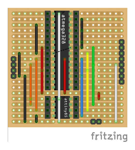 Con pasador de 8 pequeños de Atmel AtTiny85 microcontrolador como un independiente es una gran alternativa al más grande pin 28 AtMega328 montada en una placa Arduino Uno. He cambiado de uno a otro por diversos medios, pero lo que me pareció más fáci
