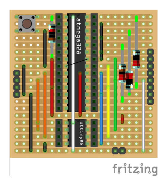 Con pasador de 8 pequeños de Atmel AtTiny85 microcontrolador como un independiente es una gran alternativa al más grande pin 28 AtMega328 montada en una placa Arduino Uno. He cambiado de uno a otro por diversos medios, pero lo que me pareció más fáci