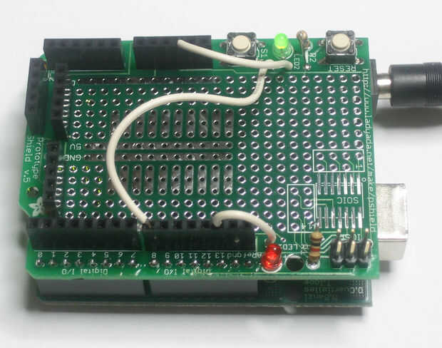 Si desea utilizar el rojo y verde LED o el botón de fines generales, simplemente soldar alambre sólido calibre (~ 22awg es bueno) en los grandes agujeros cerca del dispositivo de la soldadura. Luego conecte el otro extremo del alambre como un puente en cualquiera de los encabezados de mujer. Los LEDs están ligados a la tierra a través de resistencias de 1,5 K o 1K. El botón simplemente conecta el puente a tierra cuando presiona (utilice un pull-up interna o externa). Revise el esquema en la página de descarga para obtener detalles específicos.