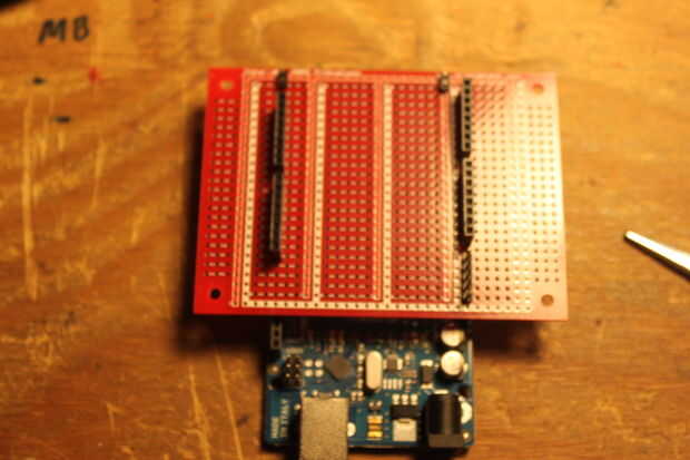 * SparkFun tiene a.Kit de MegaShield para Arduino . Esta placa es "ok" pero no rompe ninguna de las patillas hacia fuera a la zona de soldado excepto 5V y GND. Esto lo hace utilizando como un paso a través de junta más difícil. (la forma más fácil de usar el tablero es alambre del enchufe en la parte superior de los encabezados. Pegado un tablero de pan en mina y utilizarlo para prototipos menos robustos.