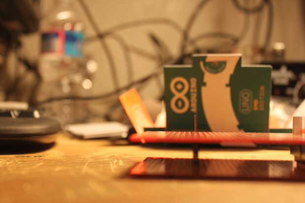 Con los headers apilables correctamente a través de la Junta en el Arduino, pongo algunos repuesto romper encabezados en las cabeceras de apilable. Esto mantiene los headers apilables en una línea recta, pero no impedirá que esa línea caiga.