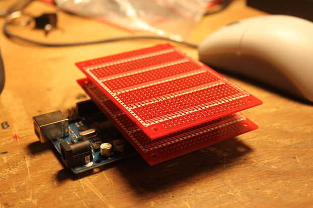 Luego apilados un segundo tablero encima de esa Asamblea. Esto mantendrá mejor la alineación sin el Mega en lugar. Me voltea el Asamblea arriba-lado-abajo y quitado el Mega.