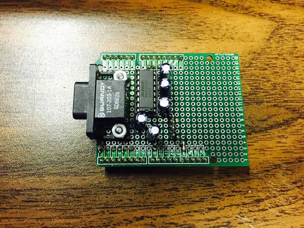 Usé un escudo de prototipado Arduino estándar. Elegí el MAX232CPE ya que tengo un montón en mano. Estos necesitan tapas de 1uF. Necesitan de otros chips más grandes o casquillos pequeños así que asegúrese de utilizar aquellas que coincidan con el chip que se selecciona.