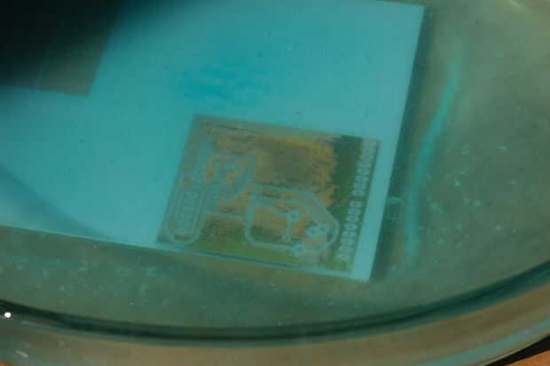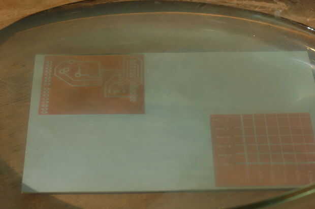 Grabar el cobre se utiliza ácido que se come el cobre pero dejarlo donde hay pintura. Crear la mezcla correcta con agua y ácido dependiendo de su proveedor. Mina fue 0,7 dl ácido y 5 dl de agua.