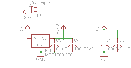 Hay una fuente de alimentación pequeña en el tablero para generar 3.3V a 250mA. No utilizamos los 3.3v 'incorporado' regulador de Arduino porque su única garantizada hasta 50mA y alguna tarjeta SD necesitan mucha potencia al escribir. Esta fuente es buena y constante, podemos usarlo como una referencia analógica también! Tenemos dos juegos de tapas de bypass para tratar de mantener ambos 5V y 3.3V agradable y limpio - 100uF son para el ruido de baja frecuencia y 0.1 para el aumento de la frecuencia