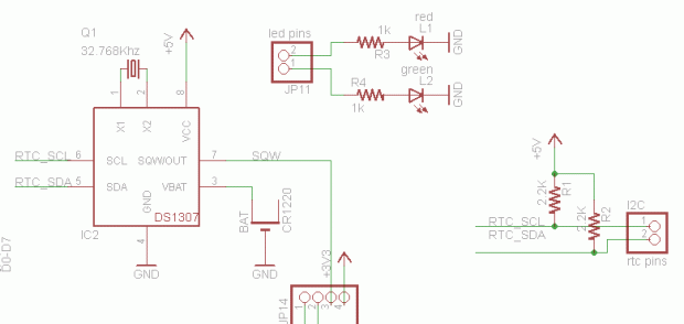 El reloj de tiempo real es el DS1307 de Maxim, que tiene un respaldo de batería (CR1220) y se comunica con el Arduino a través de i2c (las líneas SCL y SDA). I2C requiere de enderezamiento a las líneas de reloj y datos, que ves como R1 y R2 2,2 K son buenos valores, pero si estás en un aprieto, 1,0 K a 10 K probablemente funcionará bien.