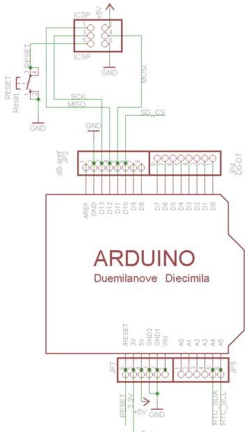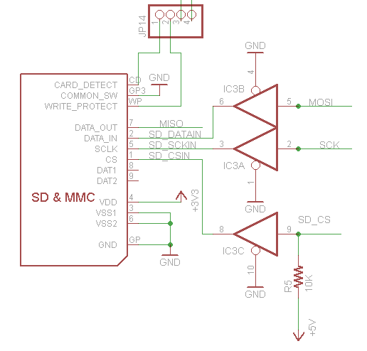 El titular de la tarjeta SD está conectado con el Arduino a través de un búfer de IC3. El buffer es un desplazador de nivel, convirtiendo las señales de 5V a 3.3V que son seguras para usar. (Para algunas tarjetas su OK para utilizar señales de 5V pero el riesgo de la tarjeta de ser dañada permanentemente!) Hay un tirón para arriba en la línea CS para que si con un programador ISP mientras hay una tarjeta en programar el Arduino, no revolverlo.