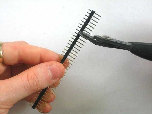 A continuación, romper la tira de 36 pines en secciones más pequeñas para que el escudo puede colocarse en el Arduino. Puede usar pinzas o cortadores de diagonal.