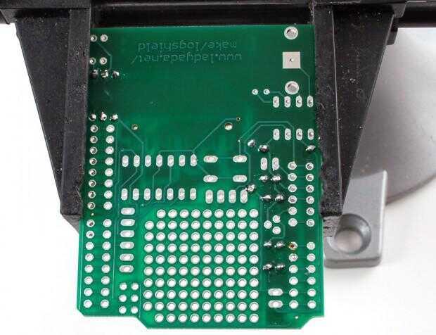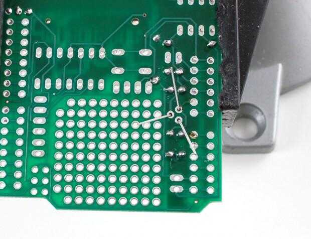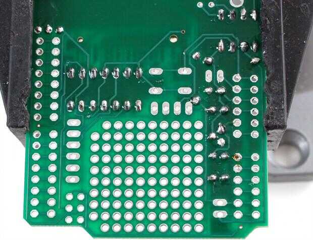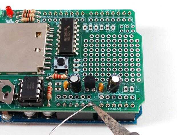 Poner el escudo en la parte superior del Arduino, por lo que la cabecera del hombre se alinee con los agujeros de la soldadura.
