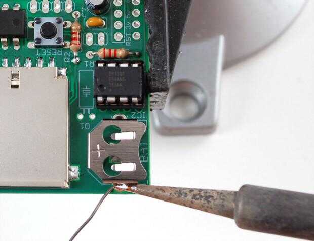 En primer lugar, derretir un poquito de soldadura en la ficha de centro del portapilas BAT. Esto hará buen contacto con la batería.
