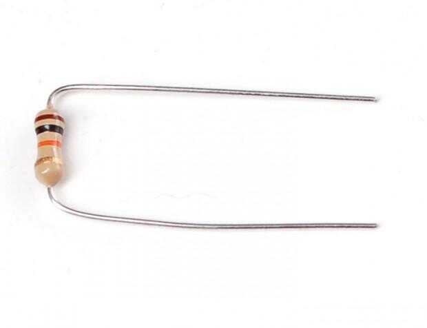 ![]() | La primera parte que vamos a soldar es una resistencia de 10K. El resistor de 10K es a rayas marrón negro naranja oro. Doble la resistencia en un elemento básico como se muestra. |