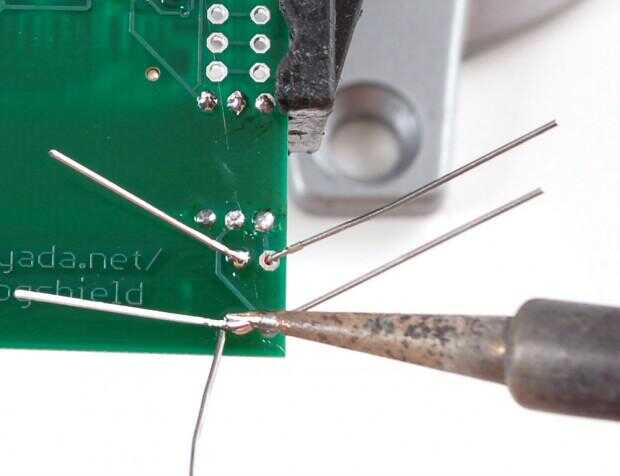 ![]() ![]() | Voltee el PCB. Con su Cautín, mantenga caliente tanto la almohadilla (el anillo plateado alrededor del agujero) y cable () al mismo tiempo durante 2 ó 3 segundos. Luego meter el extremo del cable en crear una Junta de soldadura agradable. Hacer esto para ambos conductores. |