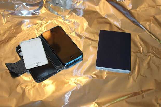 La idea es utilizar el papel de aluminio como la Fundación para el blindaje de RF y utilice capas superpuestas de cinta adhesiva de aluminio para agregar resistencia y rigidez, seguida por la cinta de conducto fibroso para agregar color y para camuflar el verdadero propósito de la bolsa - se parece a una bolsa de almuerzo pequeño de cinta adhesiva. No sirve llamar la atención sobre la bolsa si no tienes que.