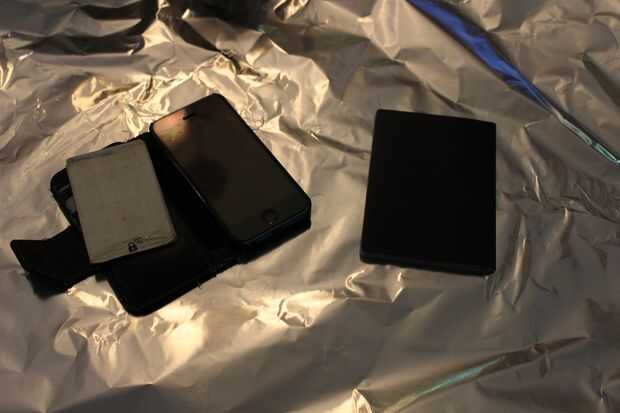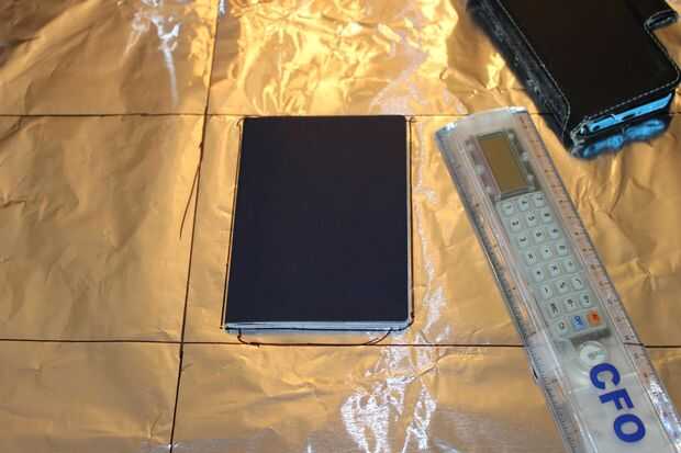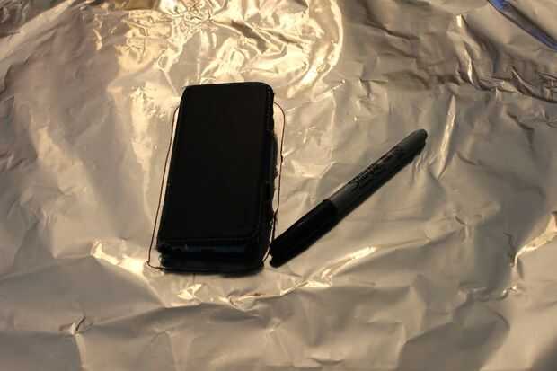 Use el marcador para detallar su teléfono y luego indicar tamaño de otra cosa que desea almacenar en la bolsa - en la parte superior del teléfono. Aviso en las anteriores fotos, el pasaporte es más ancho que el teléfono y el teléfono es más alto que el pasaporte - tomar el mayor de ambas mediciones y mida 1/4" a 1/2" más allá del tamaño de las cosas para tener una idea del tamaño básico de la bolsa.